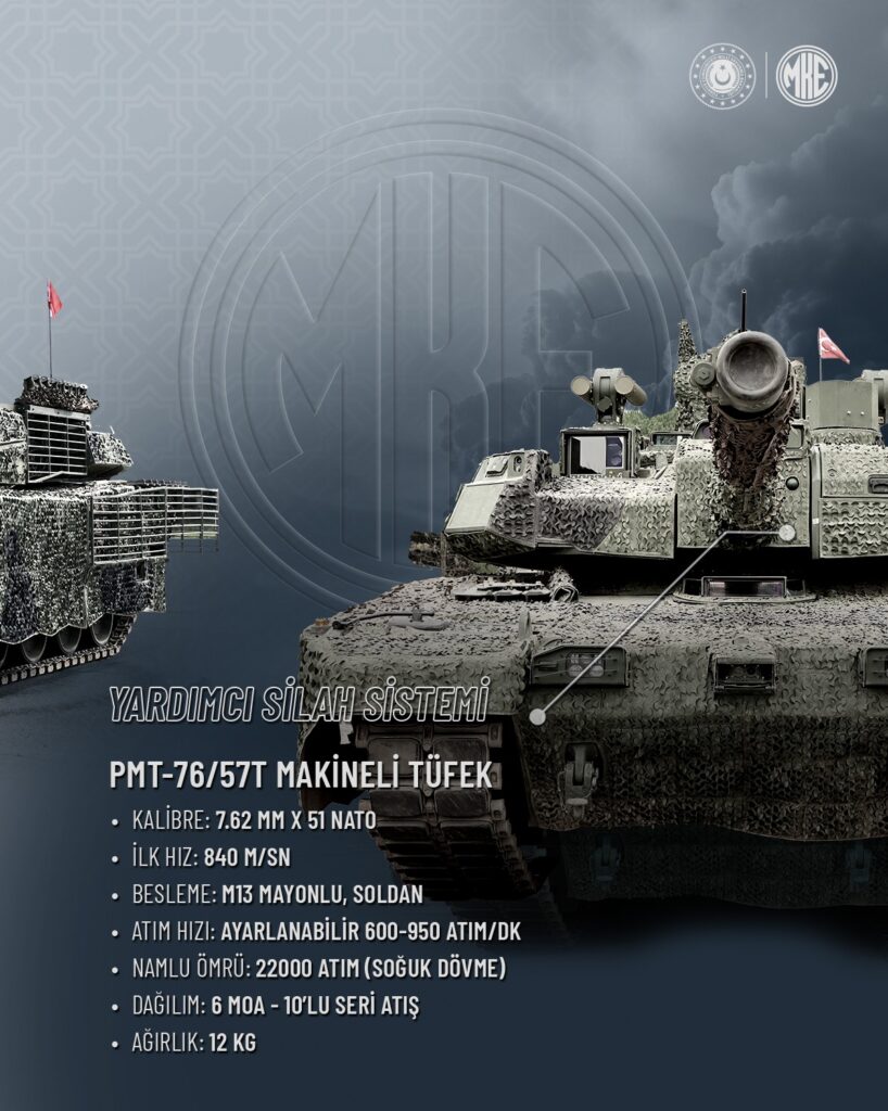 Kuleye eş eksenli olarak yerleştirilen yardımcı makineli tüfek PMT 76/57T (7.62 mm) de MKE mühendislerinin özgün tasarımı. Çanakkale’de 57’nci Alay anısına adlandırılan sistem, yüksek isabet oranı ve üstün yetenekleriyle öne çıkıyor. Yaklaşık 12 kilogram ağırlığındaki makineli tüfek, dakikada 950 atış kapasitesine sahip.