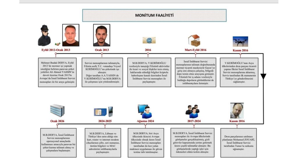 MOSSAD’ın verdiği yönergeler doğrultusunda Derya ve Kerimoğlu, attıkları her adımı dış istihbarat servisine aktardı. Türkiye ve Orta Doğu’daki ticari faaliyetlerini arttıran şüpheliler; Filistin politikalarına muhalif isimlerle sosyal ve ticari temaslar kurdu, bu kişilerle ilişkilerini izleyip edindikleri bilgileri İsrail servisine iletti. Gazze’de depolar ve bölgeler hakkında fotoğraf ve bilgi aktardıkları da istihbarat raporlarına yansıdı.