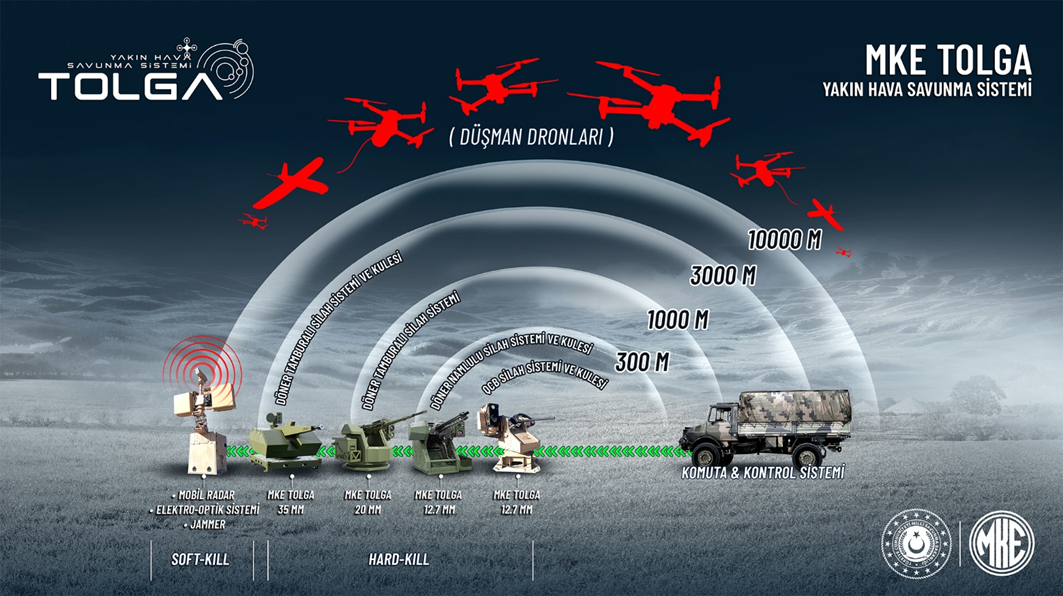 MKE’nin tamamen yerli imkânlarla geliştirdiği TOLGA sistemi, düşük maliyetli operasyon imkânı ve modüler mimarisiyle dikkat çekiyor. Sistem; sabit tesisler, mobil platformlar, zırhlı veya zırhsız araçlar ve deniz platformlarına entegre edilebiliyor. Radar, elektro-optik ve jammer bileşenleri sayesinde 10 kilometreye kadar hedef tespiti yapabilen TOLGA, tehdit unsurlarını hem elektronik karıştırma yoluyla hem de doğrudan atışla etkisiz hale getirebiliyor.